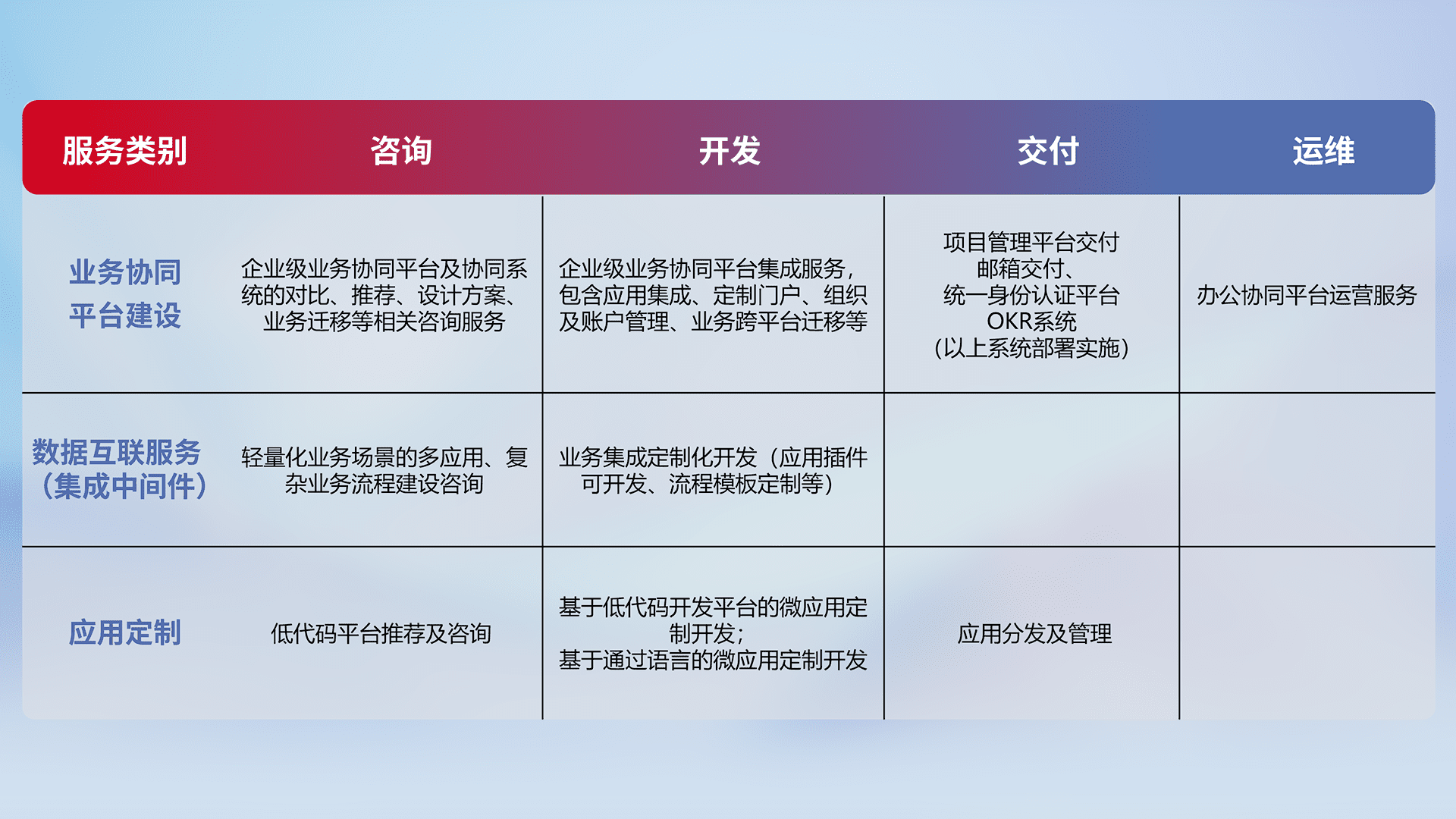 针对钉钉、、企微、、、IDaas等平台级产品提供产品的规划、、、、方案、、交付、、定制化开发等服务,,,,实现如统一协同办公、、、智能客户服务、、、、混合会议管理、、、、智能数据查询、、、、等业务场景,,,实现数字化转型。。。