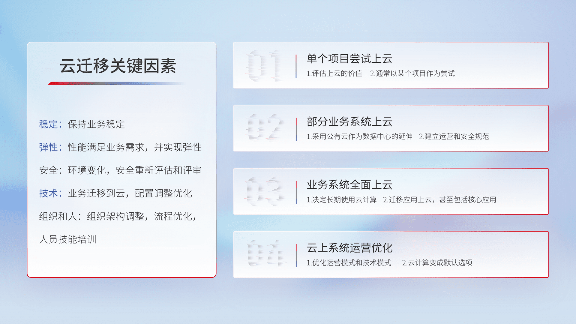 结合实际业务,,,,从规划设计、、、云平台选型、、云原生改造、、、数据迁移、、、集成交付,,迁移全过程为客户识别最佳上云路径,,,,做好风险识别管理,,,设计网络架构、、、身份权限、、安全审计合规、、、操作审计、、、日志审计、、、、监控告警策略、、多站点容灾设计等,,,对云上基础设施进行整体规划,,,提升IT治理水平,,,,以满足弹性、、、高可用、、、、高性能的需求。。