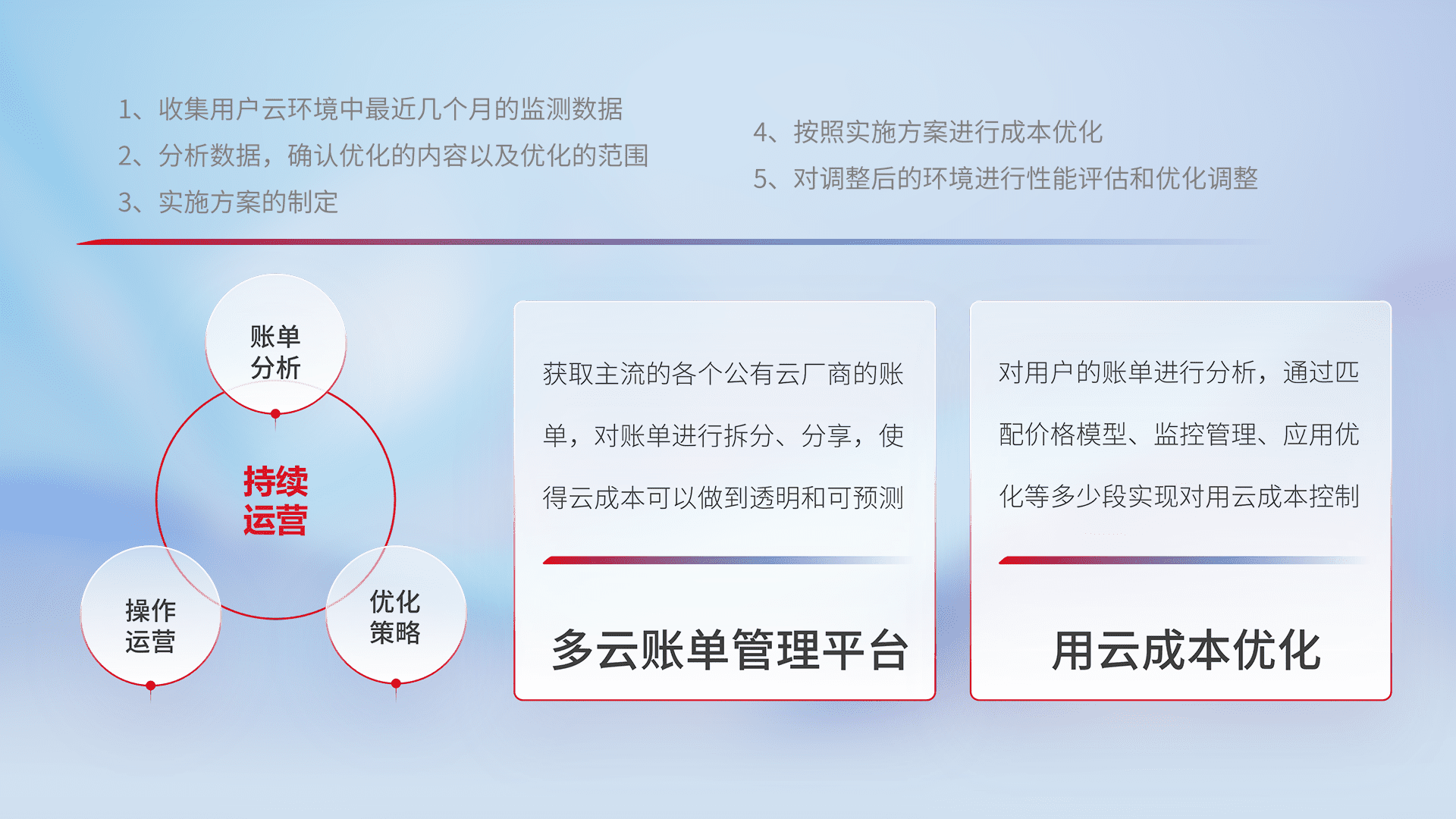 通过多云纳管,,以统一的资源数据模型把客户的云资源进行抽象和封装,,,,进而实现对多云资源的统一操作,,保障云资源管理的可靠性、、、稳定性与可用性。。。量身定制化运维内容,,,配置、、开发运维、、、、补丁管理、、、、备份、、、、监控、、认证和访问管理、、、审计和日常巡检等,,,保障在用云过程中的可靠度,,,稳定度以及高可用率。。。
