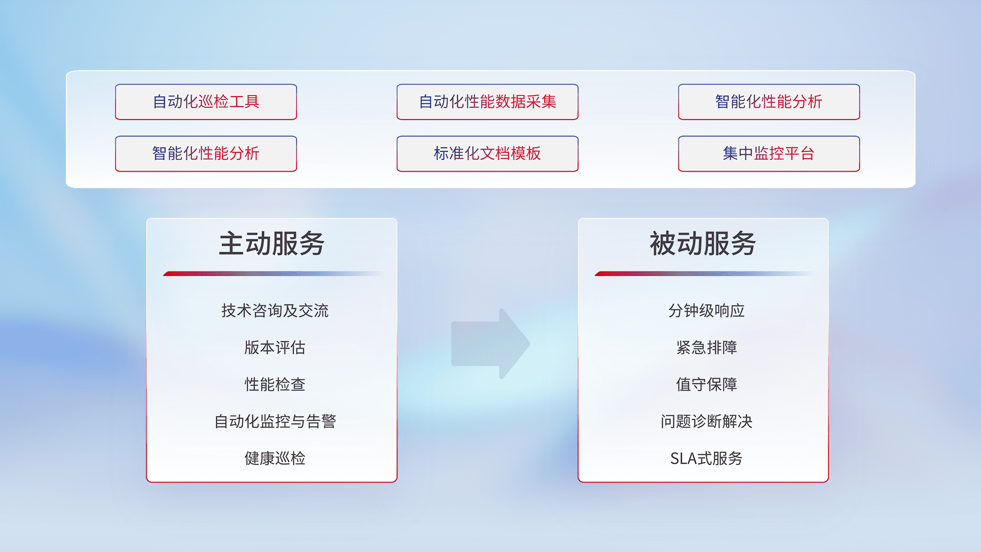 智能化工具和标准化文档,,,保障服务质量,,提供主动服务(包含技术咨询、、、、版本评估、、、、性能检查、、、自动化监控与告警、、、健康巡检)和被动服务包含(分钟级响应、、、紧急排障、、、值守保障、、、问题诊断解决、、、、SLA服务)。。